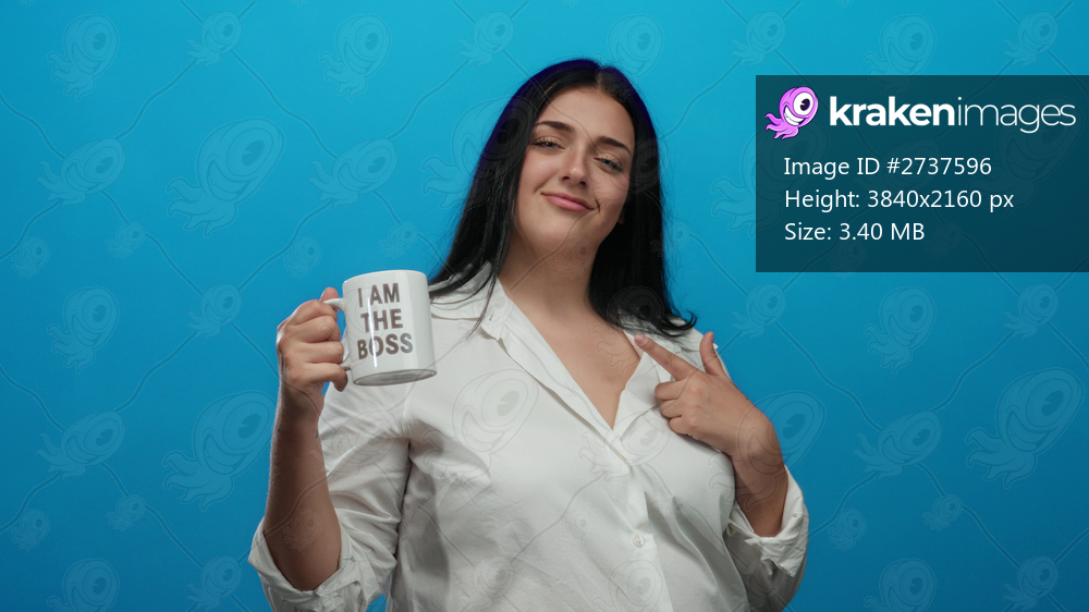 Woman holding mug with confident smile against blue background emphasizes empowerment and self-assurance with plus size representation.