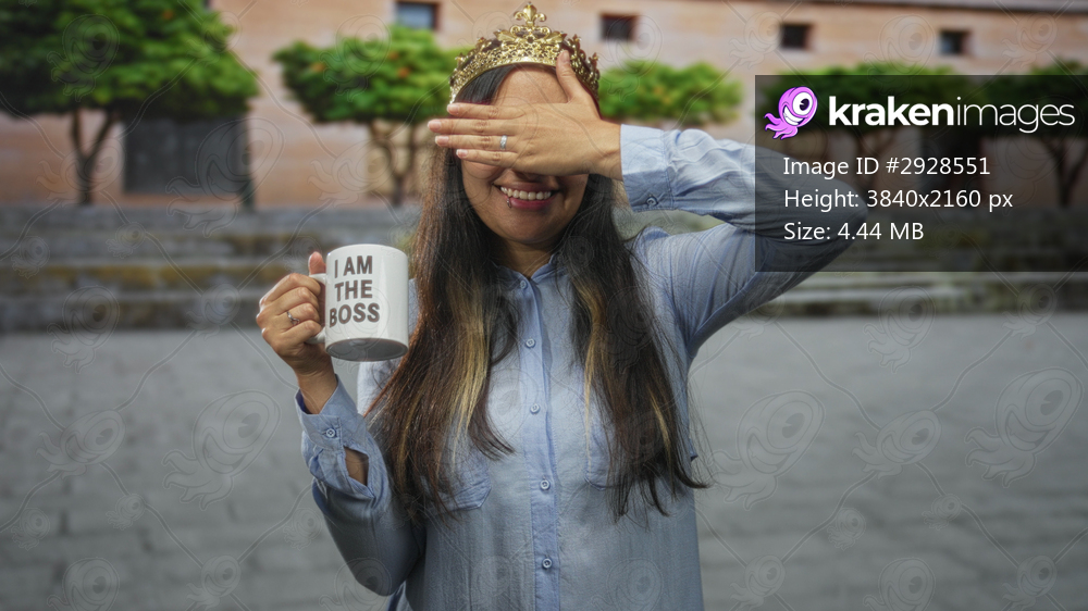 Woman holding mug with text i am the boss and hand covering eyes, wearing crown on street in old town; confidence empowerment.