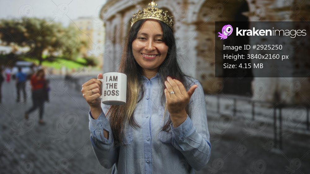 Woman holding mug that reads i am the boss and wearing a crown in front of colosseum building, pointing finger gesture; confidence leadership.
