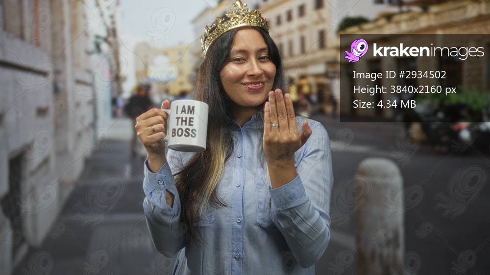 Woman holding mug that says i am the boss and pointing finger in street with crown visible; confidence leadership.