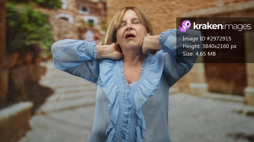 Woman holding neck with both hands, eyes closed, standing on a cobbled street by stone steps and an arched door; relief.