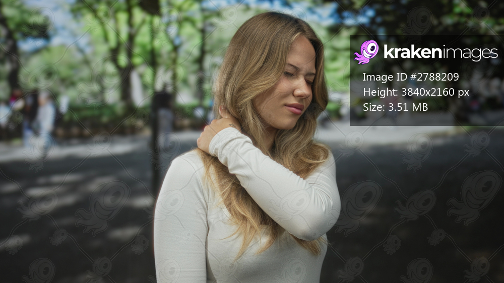 Woman holding neck with closed eyes in green park shaded by tall trees under sunlight; pain discomfort tension.