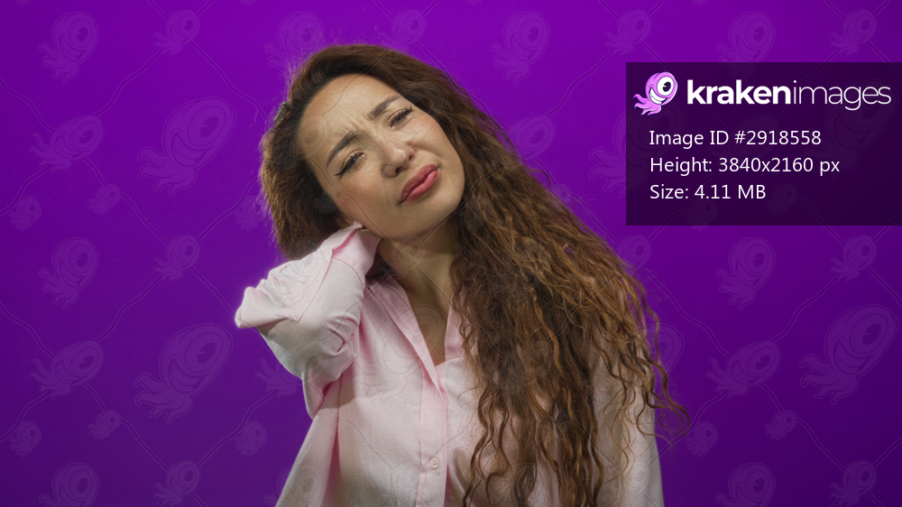 Woman holding neck with hand in studio with purple backdrop, wearing pink shirt and long curly hair clearly visible; discomfort.