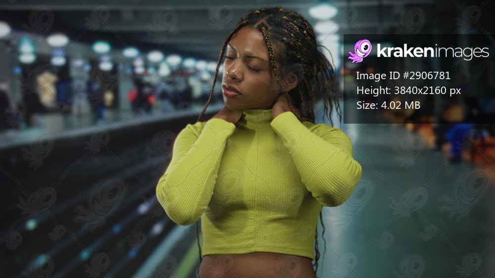 Woman holding neck with hand showing neck pain and exposed midriff at a train platform inside a building; discomfort.