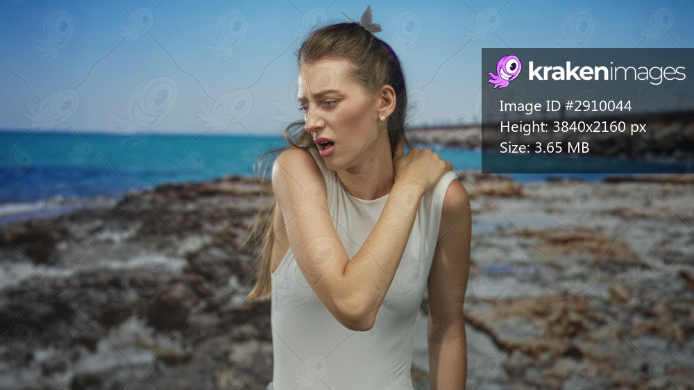 Woman holding neck and shoulder with hand on rocky beach, wincing in discomfort as wind tugs hair; pain vulnerability.