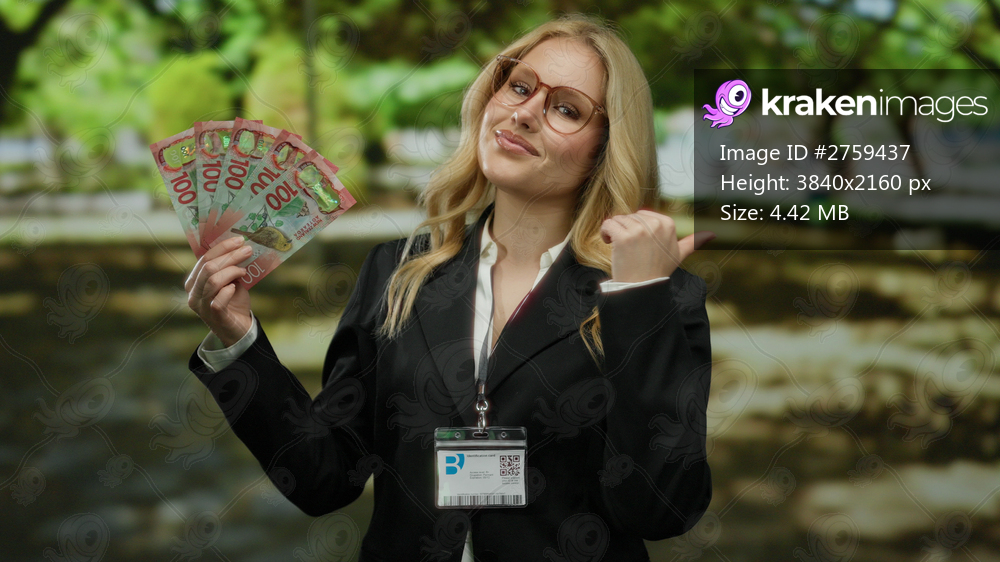 Woman holding new zealand dollars in park showing id card smiling under green trees wearing glasses and black suit