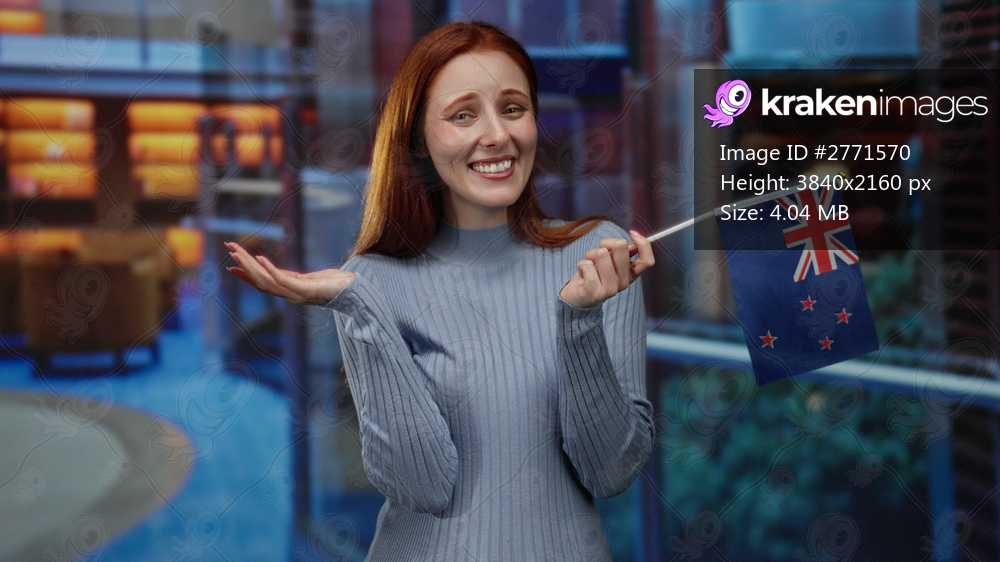 Woman holding new zealand flag indoors in hotel smiling with happiness showcasing patriotism and joy in modern setting with elegant redheaded hair and stylish sweater - Kraken Images