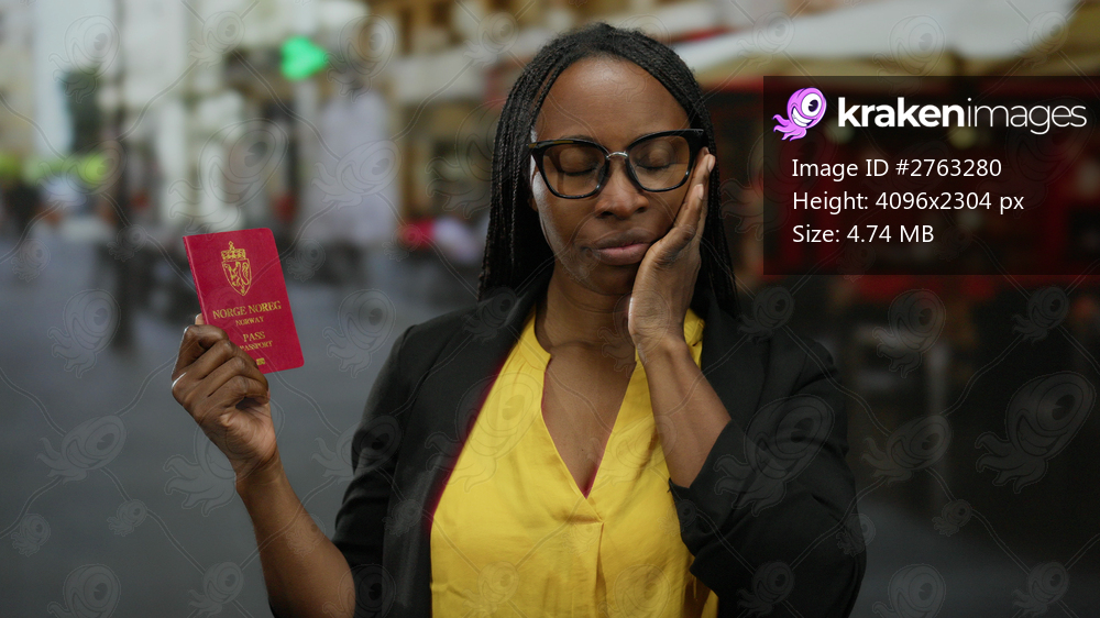 Woman holding norwegian passport on street terrace with closed eyes, wearing glasses and yellow shirt, city background blurry, suggesting travel and contemplation. - Kraken Images