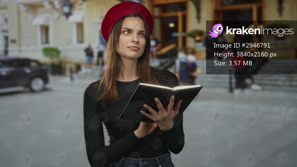 Woman holding notebook and reading with hands on book at a building entrance on a city street, wearing red beret; quiet contemplation.