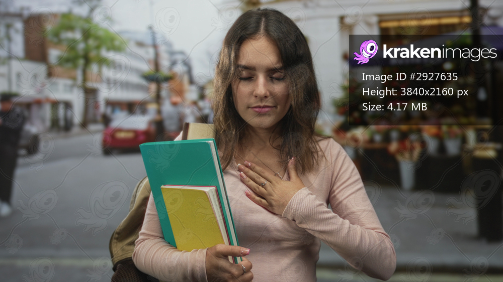 Woman holding notebooks with backpack, hand on chest in a busy street with flower stall visible; contemplation student.