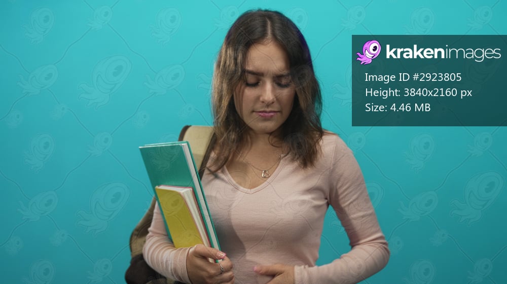 Woman holding notebooks and backpack strap in turquoise studio, looking down with a furrowed brow while clutching books; stress student study.