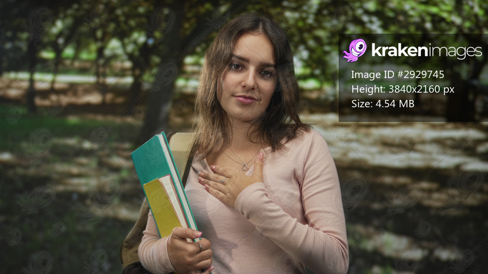 Woman holding notebooks and folders, hand on chest and backpack strap visible standing under trees in park; gratitude.