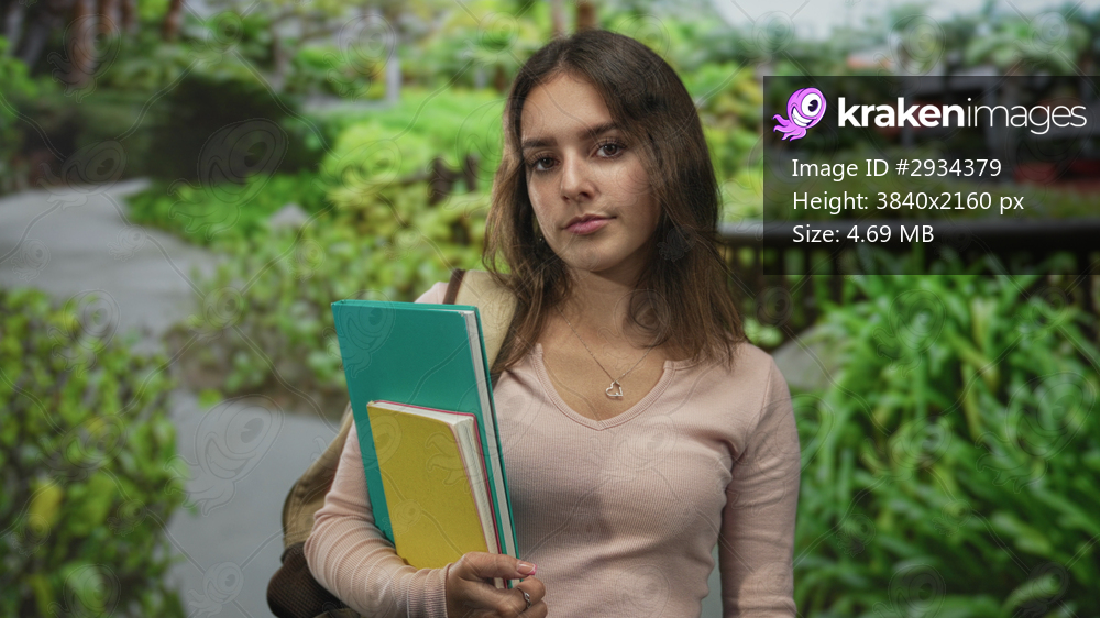 Woman holding notebooks and gripping a yellow journal while wearing a backpack on a park path with green foliage and wooden railing; study focus contemplation. - Kraken Images