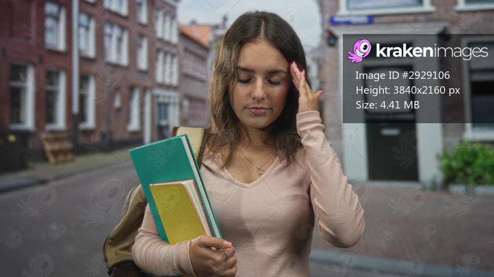 Woman holding notebooks and touching temple on street beside brick building and door, backpack slung over shoulder with green and yellow notebooks visible; academic stress. - Kraken Images