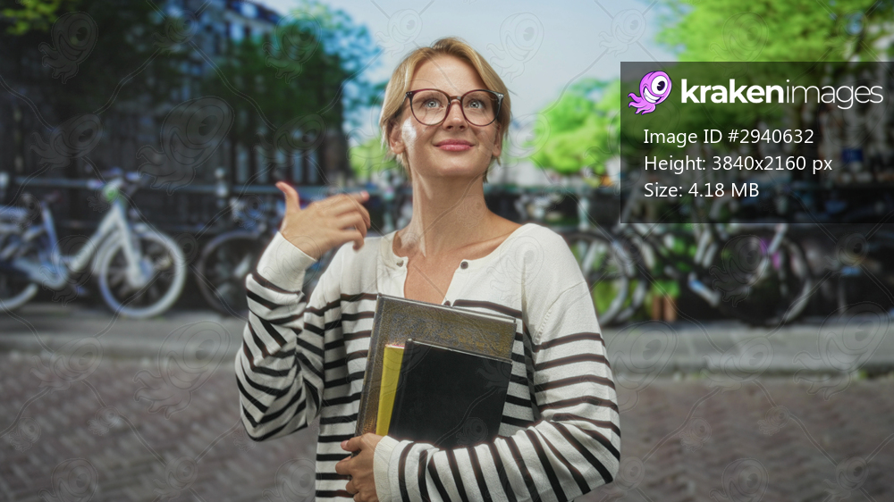Woman holding notebooks waves hand on street with parked bicycles and cobblestone pavement; confidence learning.