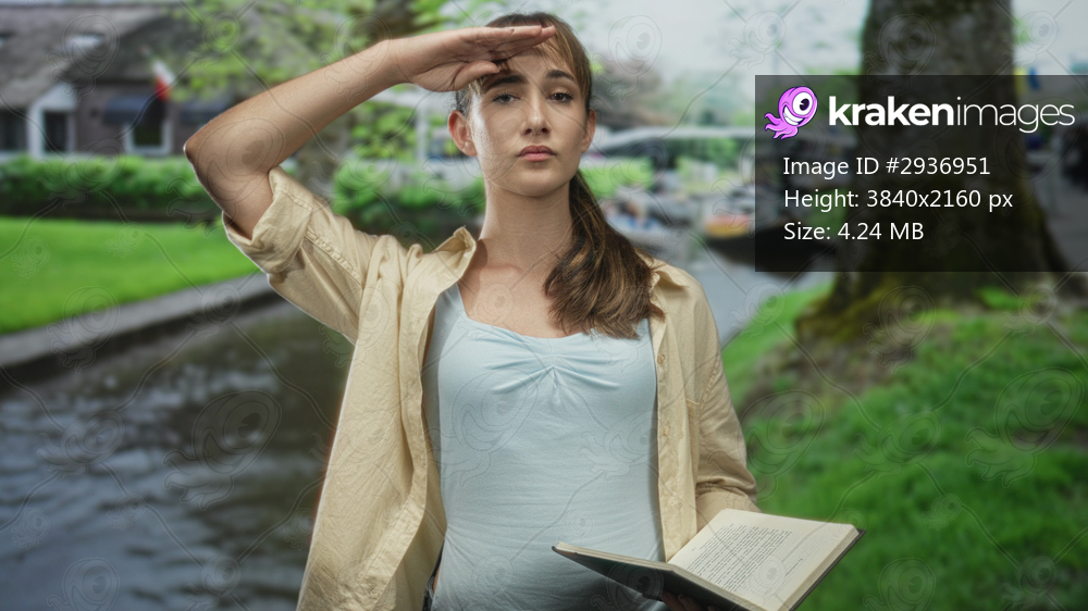 Woman holding open book salutes with hand to forehead on street by canal and boats in amsterdam; quiet determination.