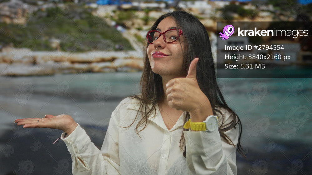 Woman holding open hand and finger pointing to palm on a sunlit sandy seaside beach with turquoise water; confidence.