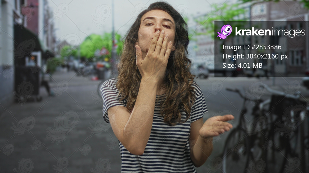 Woman holding open hands and smiling brightly amid parked bicycles on city street lined with green trees; affection.