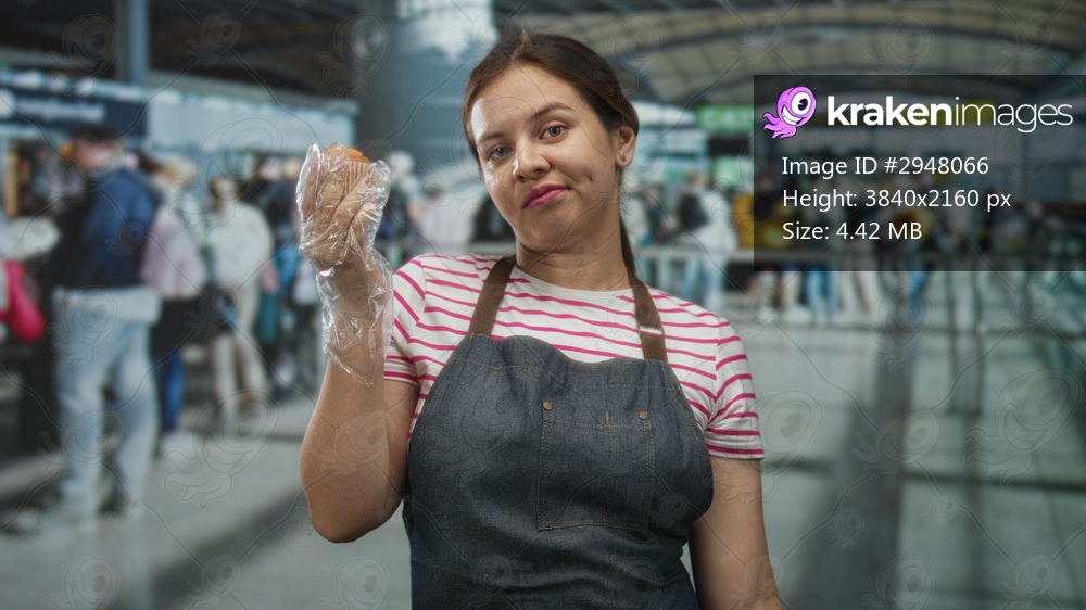 Woman holding orange in a gloved hand at a crowded airport terminal wearing an apron and striped shirt; hygiene concern boredom.