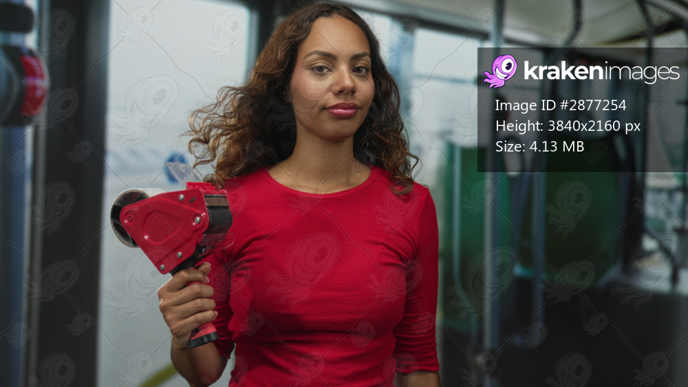 Woman holding packing tape dispenser in right hand while standing in bus aisle wearing red top; confidence everyday task.