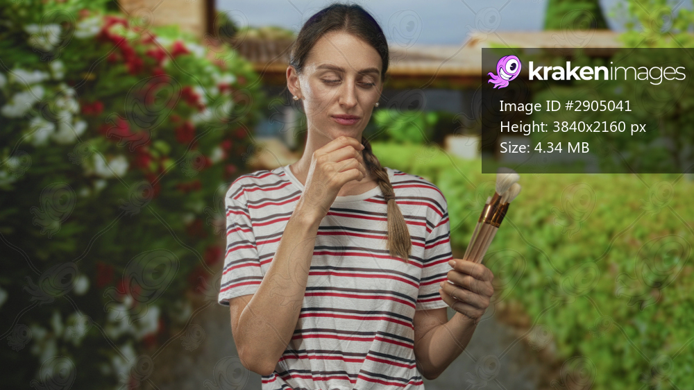 Woman holding paintbrushes with both hands at building entrance, eyes closed and smiling; creative hobby serenity.