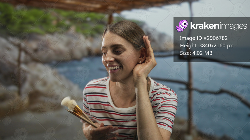 Woman holding paintbrushes and cupping her ear at seaside shelter, striped shirt visible; curiosity creative pause.