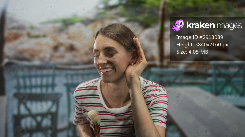 Woman holding paintbrushes cups ear with hand while smiling at a seaside cafe table in studio setting; serene creativity.