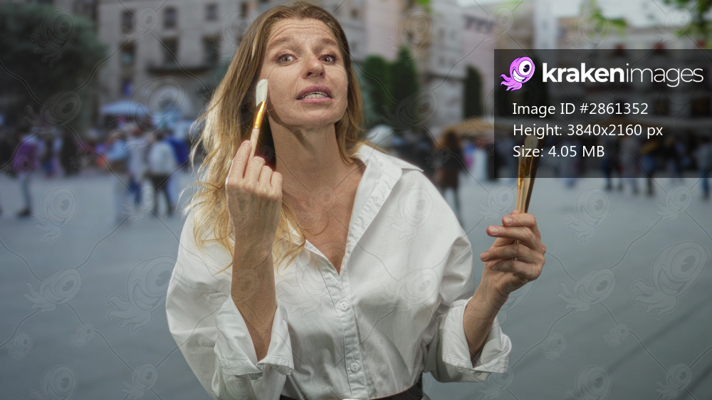 Woman holding paintbrushes and gesturing with hands on a busy street plaza filled with blurred crowd; creativity teaching demonstration.