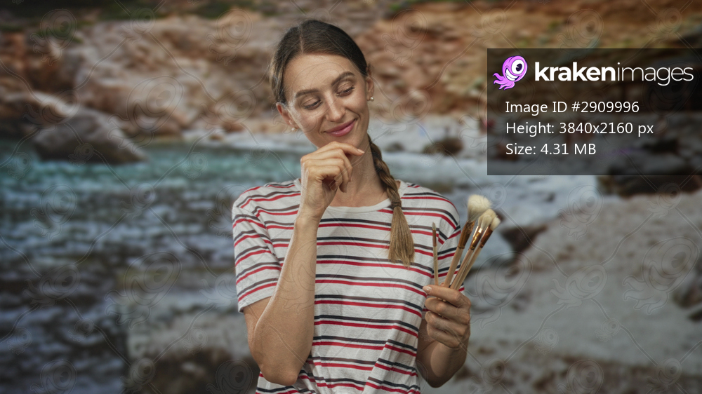 Woman holding paintbrushes with hand on chin in studio, striped shirt and braided hair, gentle smile; creative contemplation.