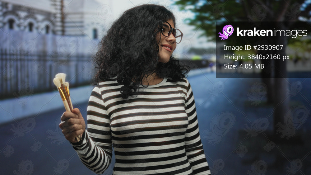 Woman holding paintbrushes on a city street beside a tree and stone building, wearing a striped top and glasses, smiling at camera; artistic confidence. - Kraken Images