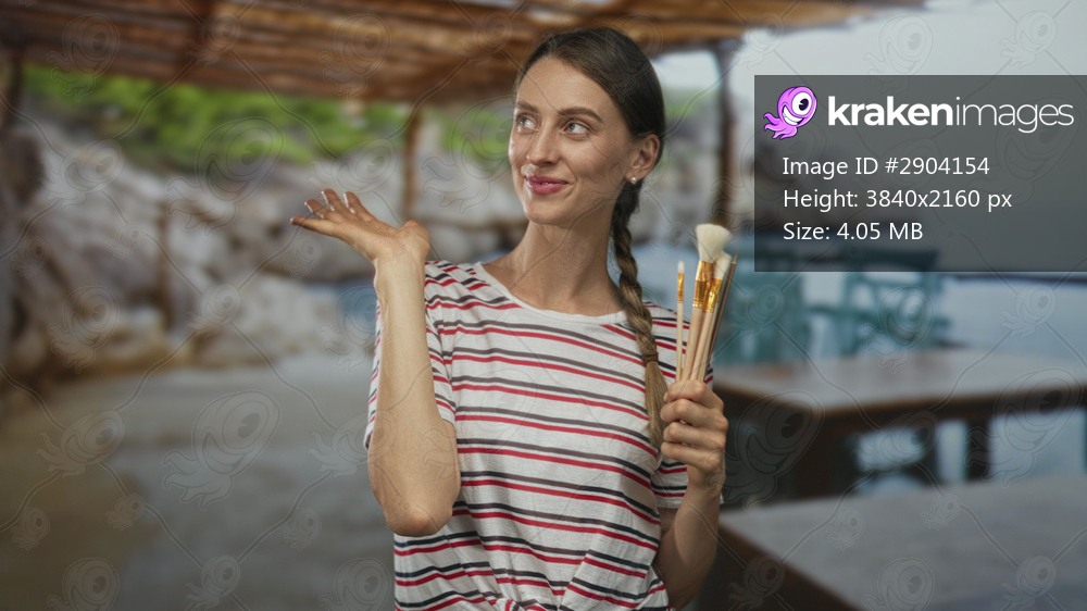 Woman holding paintbrushes and smiling, hand under chin, striped shirt at seaside cafe terrace under pergola; artistic joy.