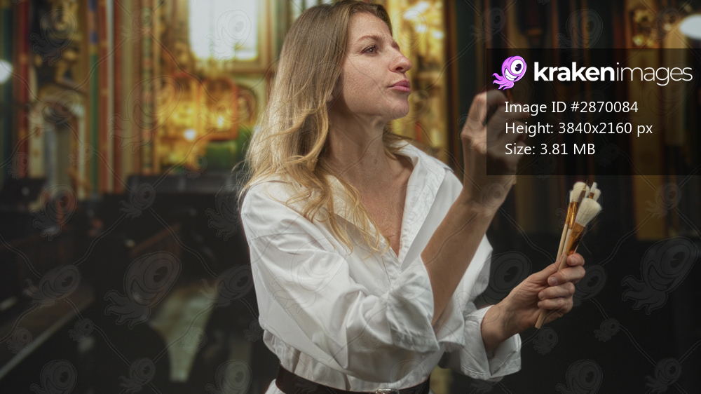 Woman holding paintbrushes and smiling while inspecting brushes inside an ornate church building; spiritual creativity joy.