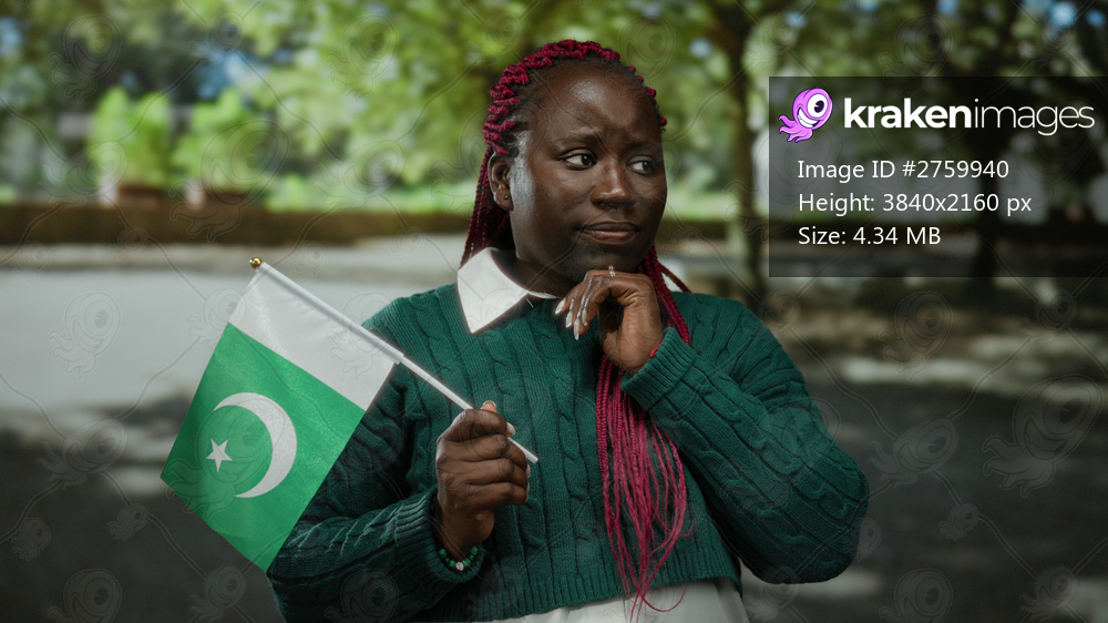 Woman holding pakistan flag outdoors in park with trees in background featuring thoughtful expression and colorful hairstyle under bright daylight suggesting cultural diversity. - Kraken Images