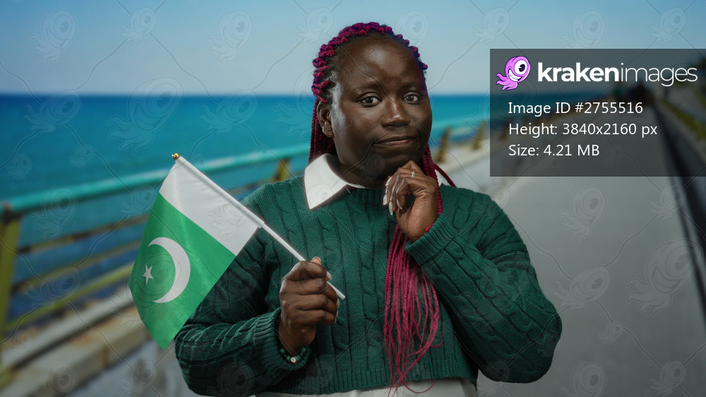 Woman holding pakistan flag standing on seaside promenade with ocean backdrop expressing diversity and cross-cultural connection through travel and tourism outdoors. - Kraken Images