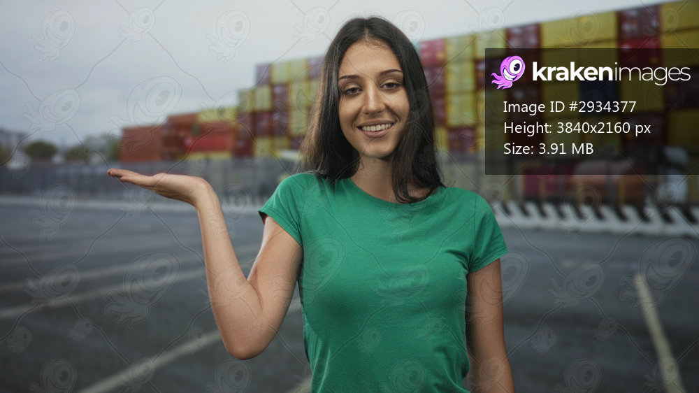 Woman holding palm up gesture on street beside stacked shipping containers and parked boats at a port, smiling with closed eyes; serenity optimism.