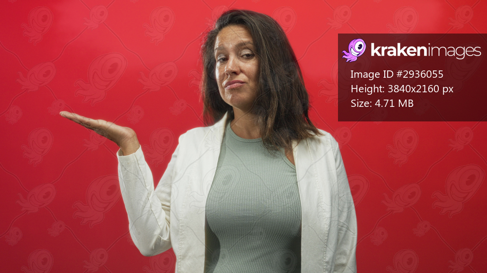 Woman holding palm up hand and looking at it, wearing white jacket and green top in studio; doubt pondering.