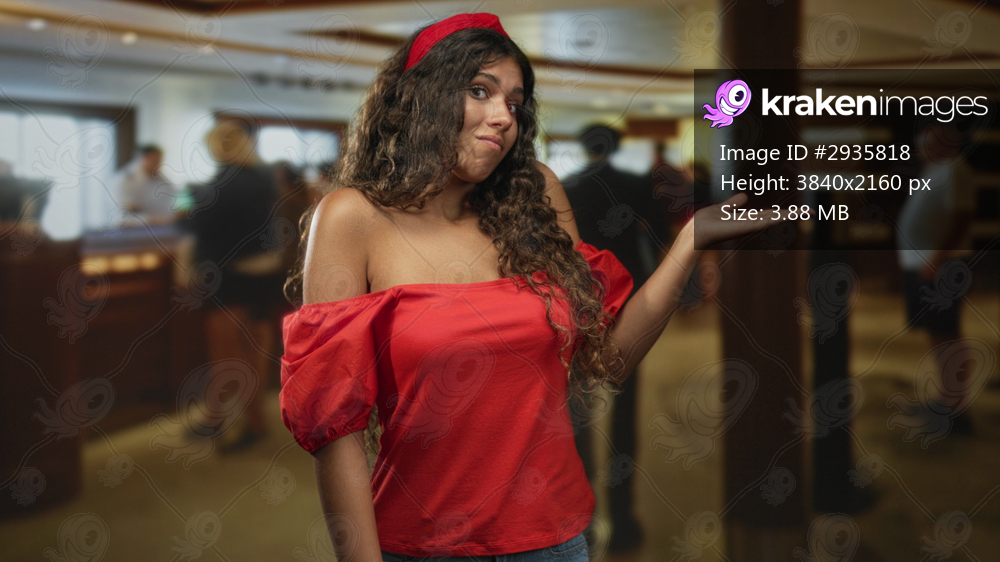 Woman holding palm up in a building reception desk, wearing red top and headband, expression puzzled and hand extended; confusion waiting.