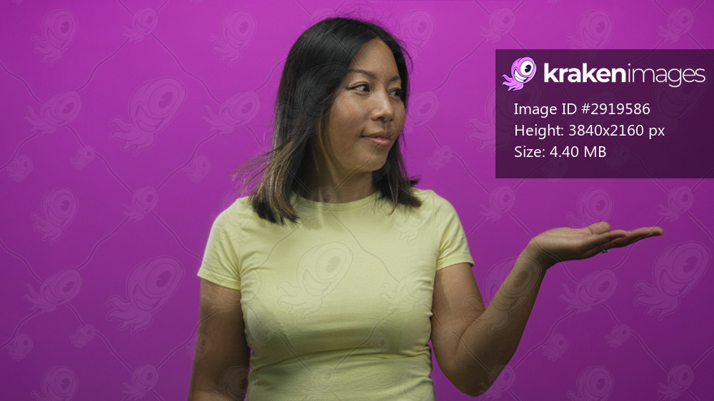 Woman holding palm up in purple studio, wearing pale yellow t shirt and facing camera with neutral expression; curious openness.