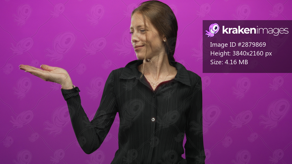 Woman holding palm up in studio against purple backdrop, smiling and looking at her hand; happiness.