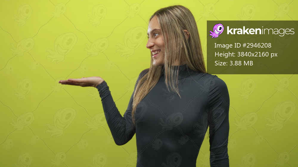 Woman holding palm up presenting and smiling in studio against lime green wall while wearing black turtleneck; happiness.