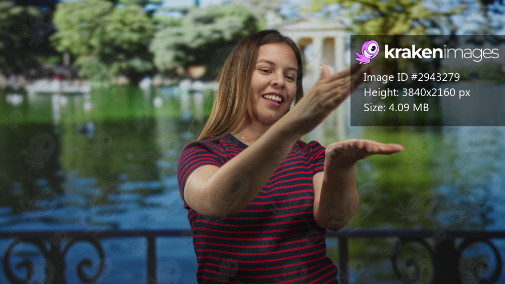Woman holding palms up near lakeside railing in park, smiling and gesturing with both hands; playful welcome.