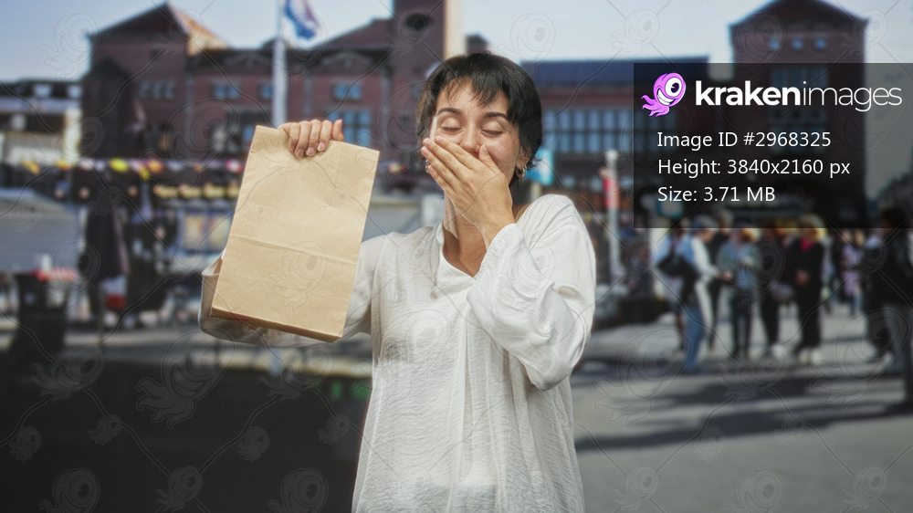 Woman holding paper bag covers mouth with hand in busy outdoor market square by brick building and crowd; surprise discovery curiosity.