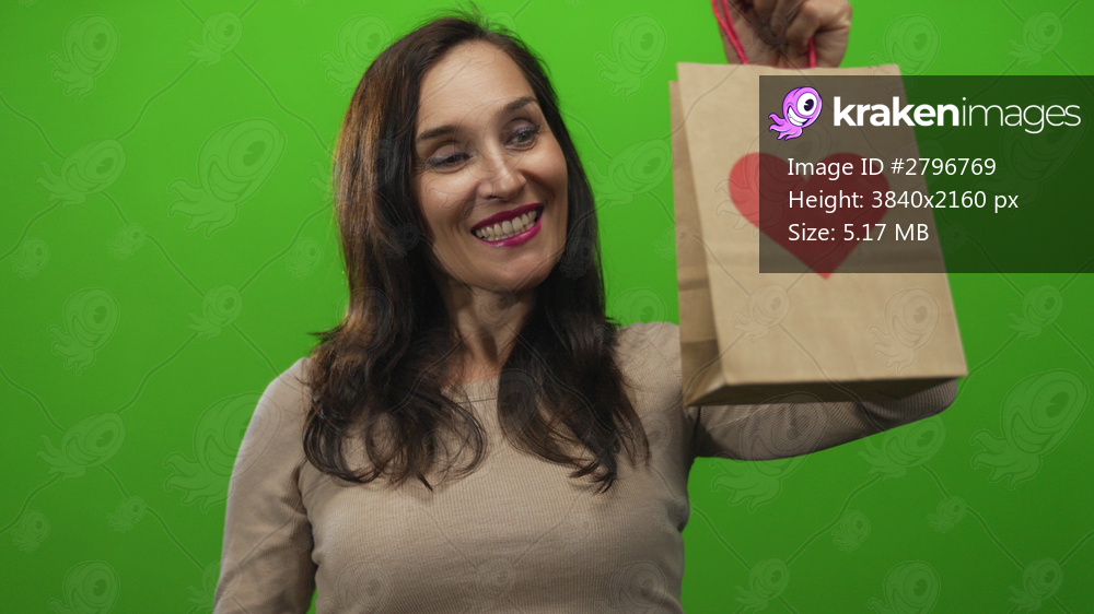 Woman holding paper bag with heart design isolated on vivid green background looking directly at camera with positive expression showcasing emotional connection - Kraken Images