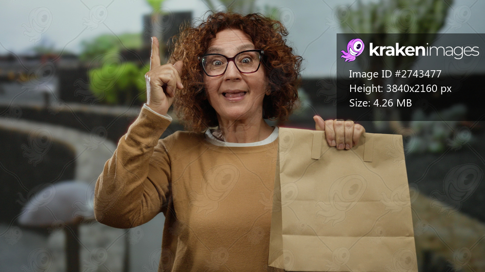 Woman holding paper bag in city street making thoughtful gestures, mid-forties, suggests a moment of inspiration in an urban outdoor setting.