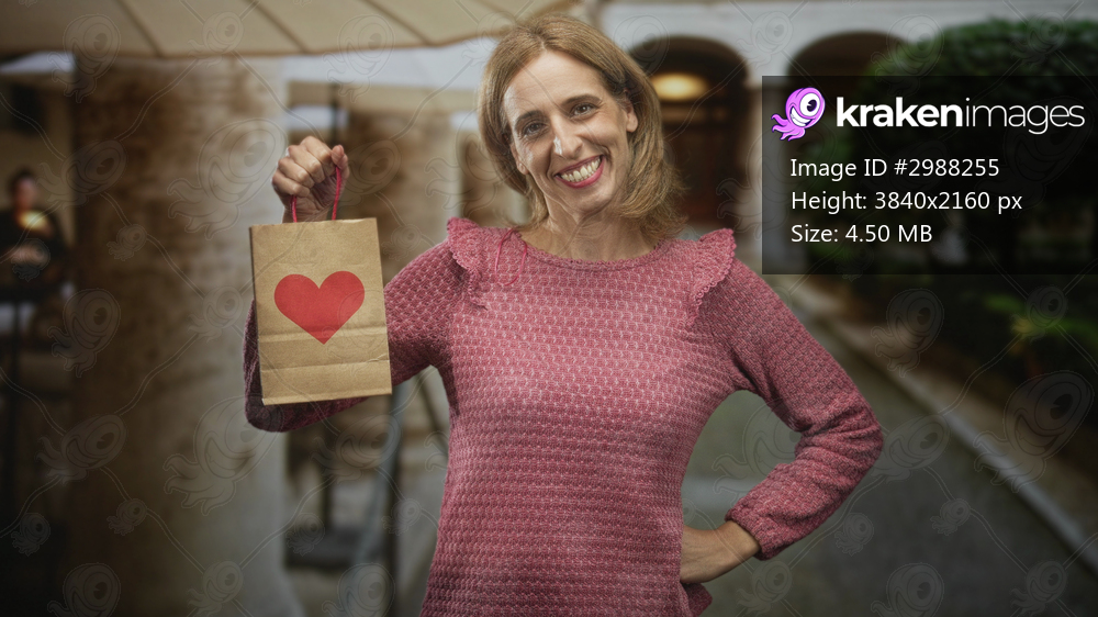 Woman holding paper bag with red heart, hand gripping the handle in a building corridor; gift giving joy.