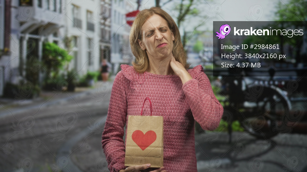 Woman holding paper bag with red heart, hand on neck and eyes closed, grimacing while clutching the gift on street by canal; heartache pain.