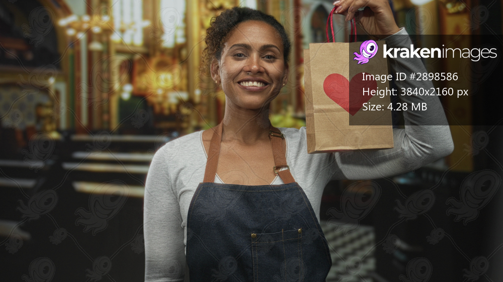 Woman holding paper bag with red heart in church building, smiling and raising the bag; generosity charity community.