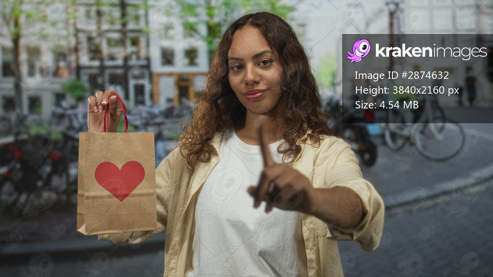 Woman holding paper bag with red heart and pointing finger toward viewer on city street; generosity giving kindness.