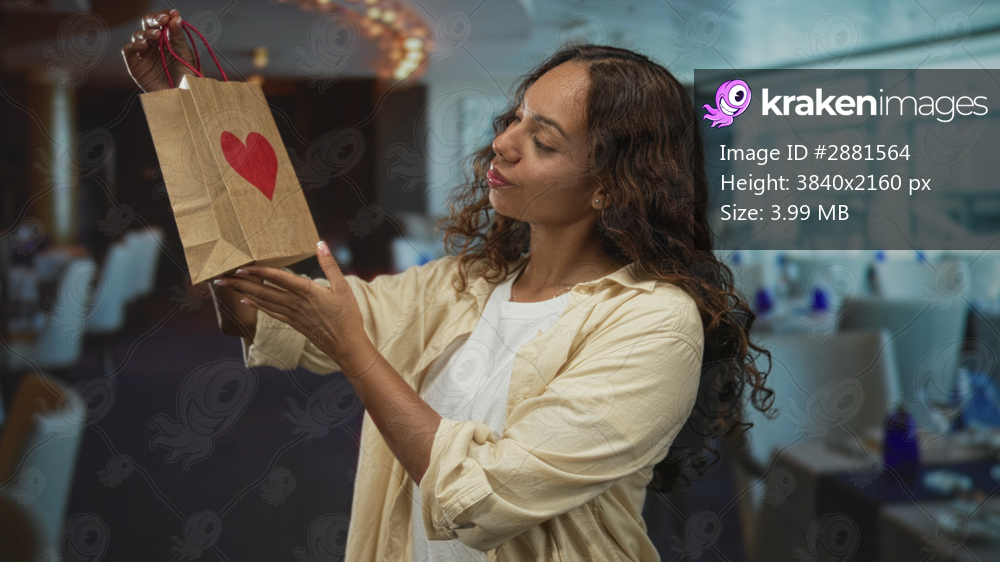 Woman holding paper bag with red heart and smiling while presenting it inside a restaurant building; gift love joy.
