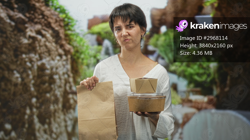 Woman holding paper bag and stacked takeaway boxes, grimacing near a fountain in a building courtyard; annoyance.